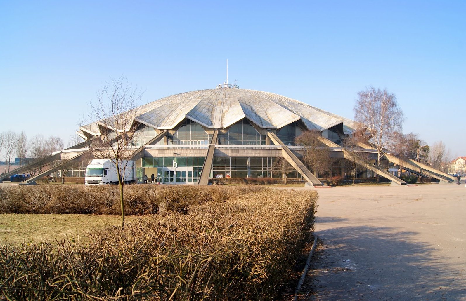 У 1969 році Президія Національної ради міста Познані ухвалила рішення збудувати спортивно-розважальний комплекс. Спочатку планувалося звести велику споруду, яка вмістила б кілька тисяч осіб на території Цитаделі. Однак 1 липня 1972 року будівництво розпочалося в парку Яна Каспровича. Згідно з міською легендою відомо, що попередній проєкт арени створив архітектор Єжи Турзенецький за два тижні після доручення йому завдання. Він узяв за основу проєкт Малого римського палацу спорту (Palazzetto dello Sport), який спроєктував італійський архітектор П’єр Нерві. Італійське натхнення та економічне обґрунтування того, що незвичайна форма дасть змогу розмістити всередині більше глядачів, зрештою визначили форму комплексу. Будівництво об’єкта тривало 23 місяці. Як підкреслювала комуністична влада, що завдяки невтомній праці познанських робітників комплекс здали в експлуатацію майже на два місяці раніше запланованого терміну. 28 червня 1974 року відбулося офіційне відкриття об’єкта. Цього дня запрошених гостей розважав Познанський оперний хор, а перший секретар воєводського комітету Польської робітничої партії Єжи Засада вручив медалі будівельникам комплексу, які відзначилися.